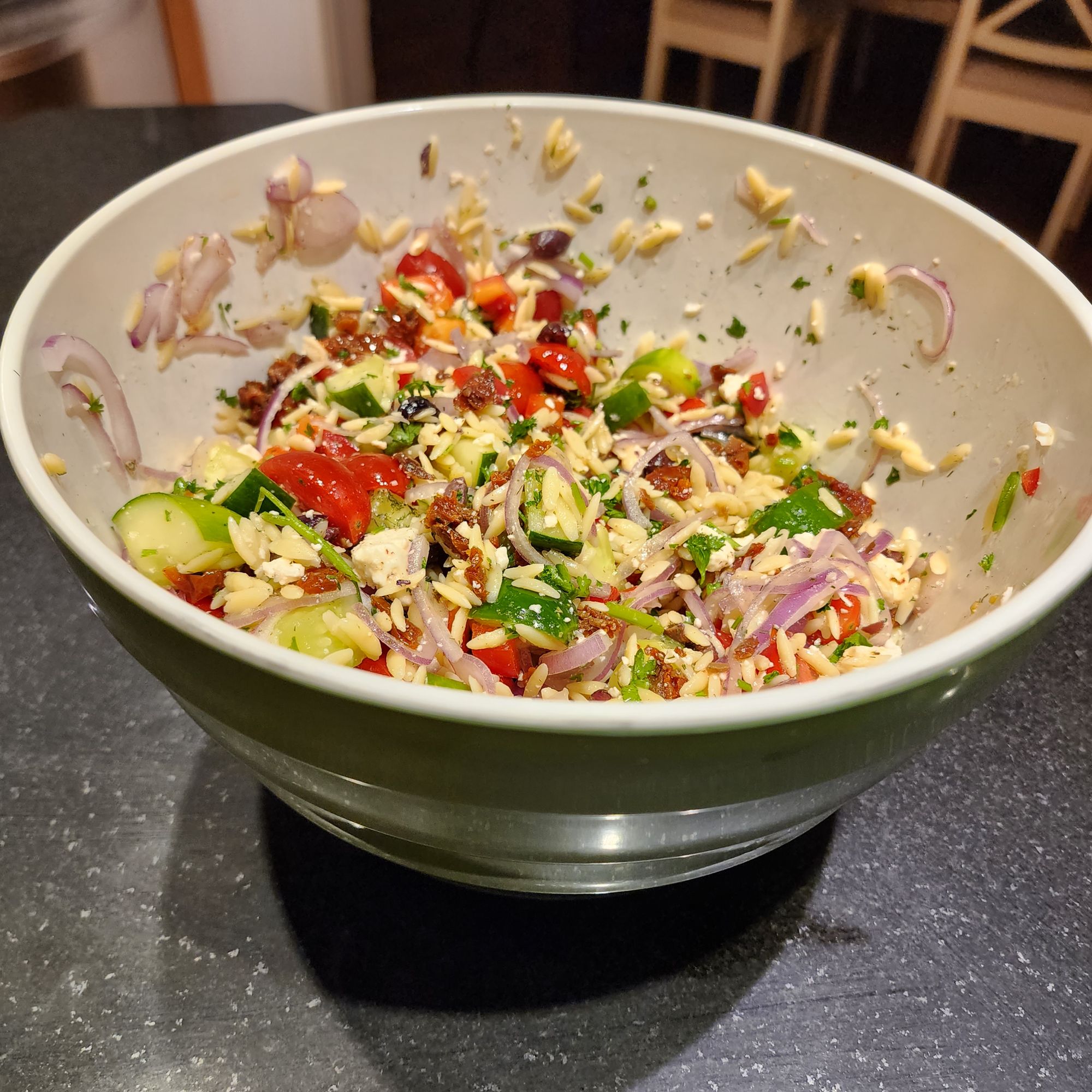 What's great about salad recipes is they do scale very well: it doesn't take much effort to make more. While we're at it chopping some onions and cucumbers, why not chop a bit more?
