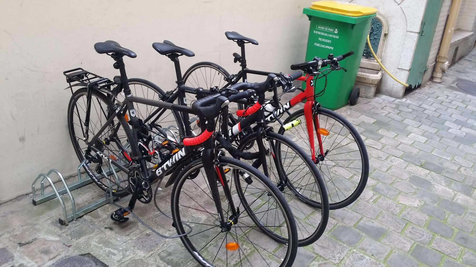 Is the Triban series a good one? Well look at the picture below taken at my office: that’s a whooping of 3 of them on the rack. That was not staged at all and I found it quite amusing.
